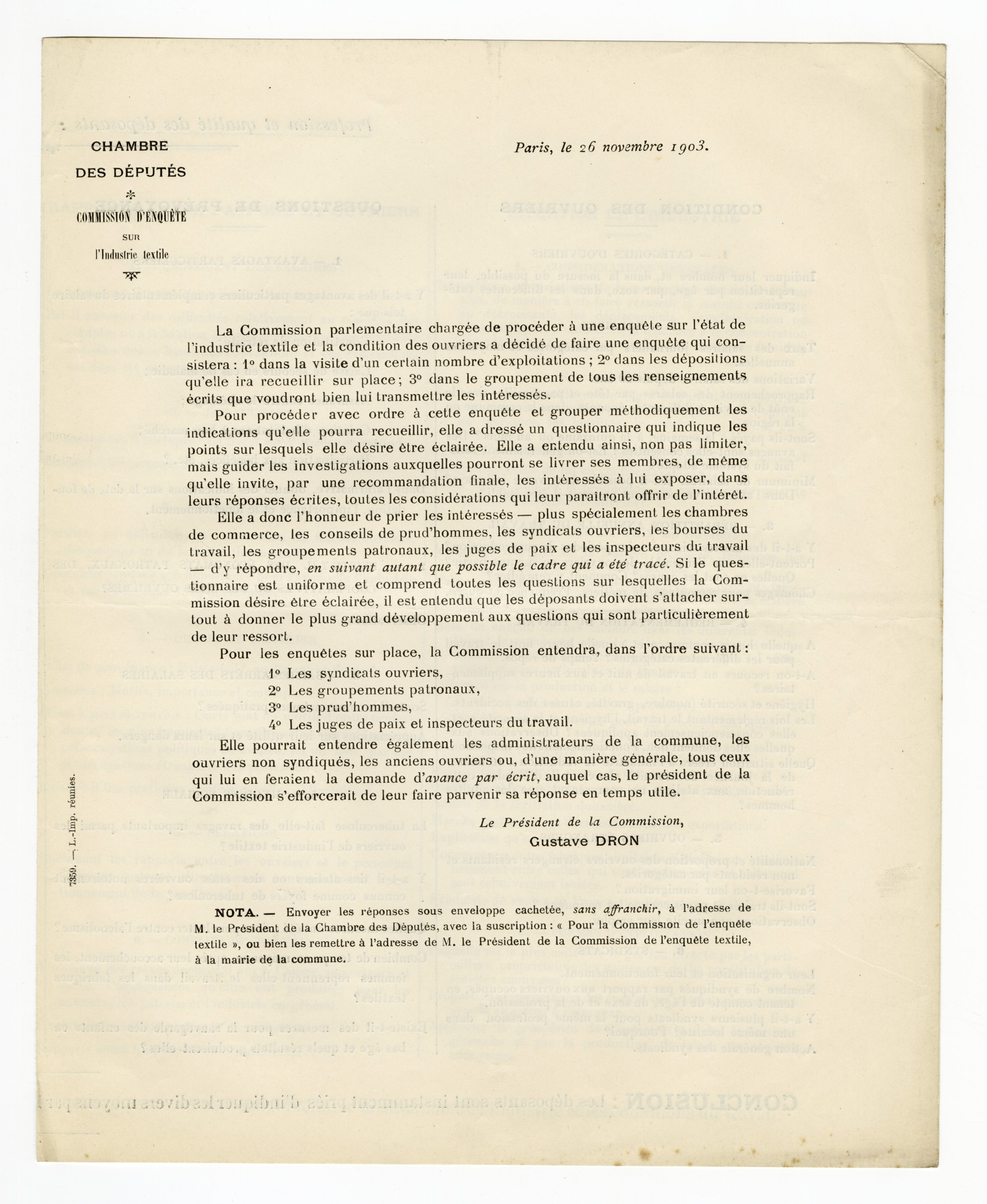 En novembre, une commission parlementaire est chargée de procéder à une enquête sur l’état de l’industrie textile et la condition des ouvriers, notamment dans le nord.