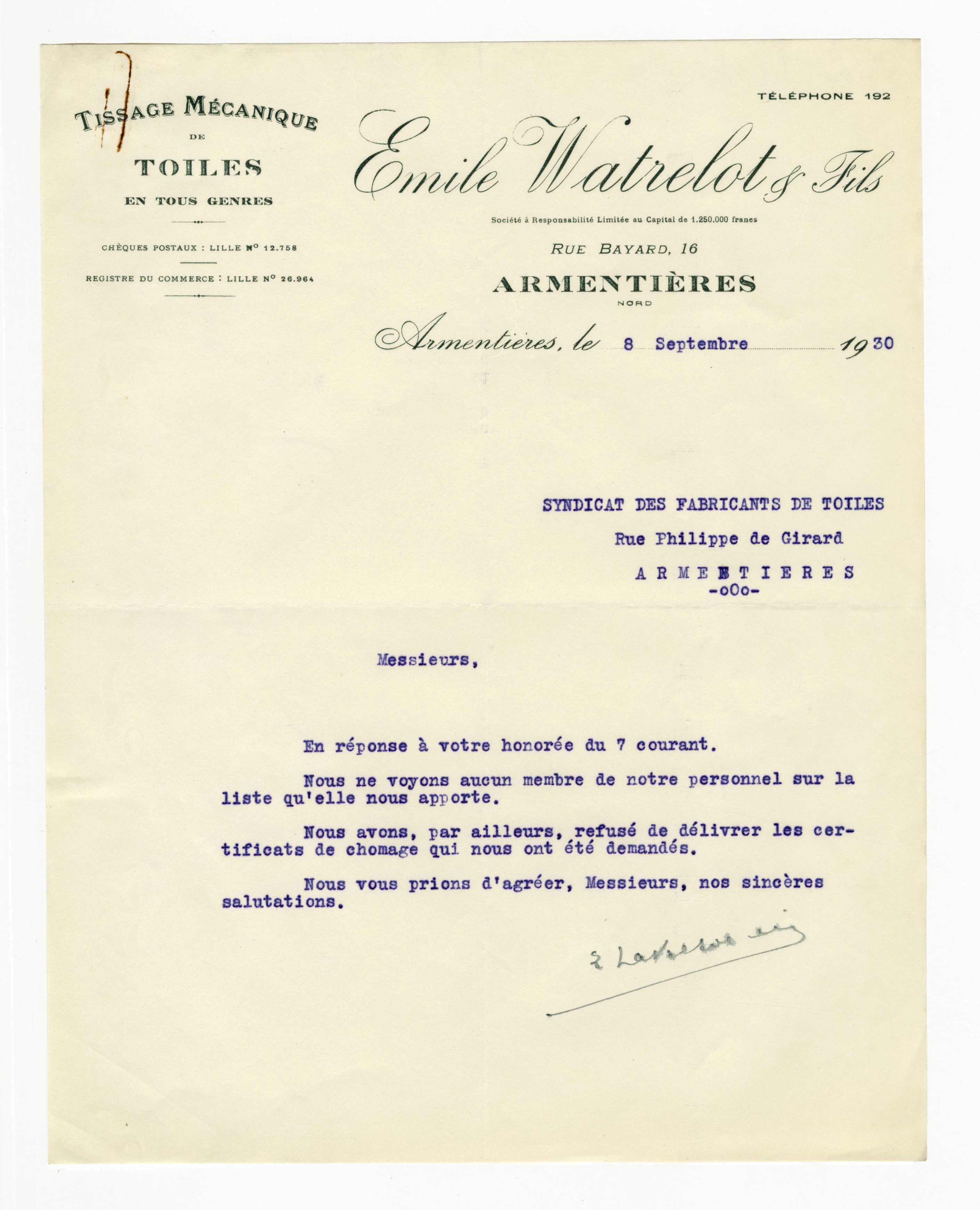 Au cours de ces grèves, les patrons unis au sein du Syndicat des fabricants de toiles d’Armentières refusent de donner leur certificat de chômage aux ouvriers grévistes. Ceux-ci ne peuvent alors, en théorie, plus trouver de travail ailleurs sans ce document. Certains patrons proposent tout de même ces certificats, ce qui provoque des réactions houleuses de la part du syndicat. Ce dernier s’insurge également contre les patrons lillois qui embauchent alors des ouvriers venus d’Armentières, sans respecter certains accords…