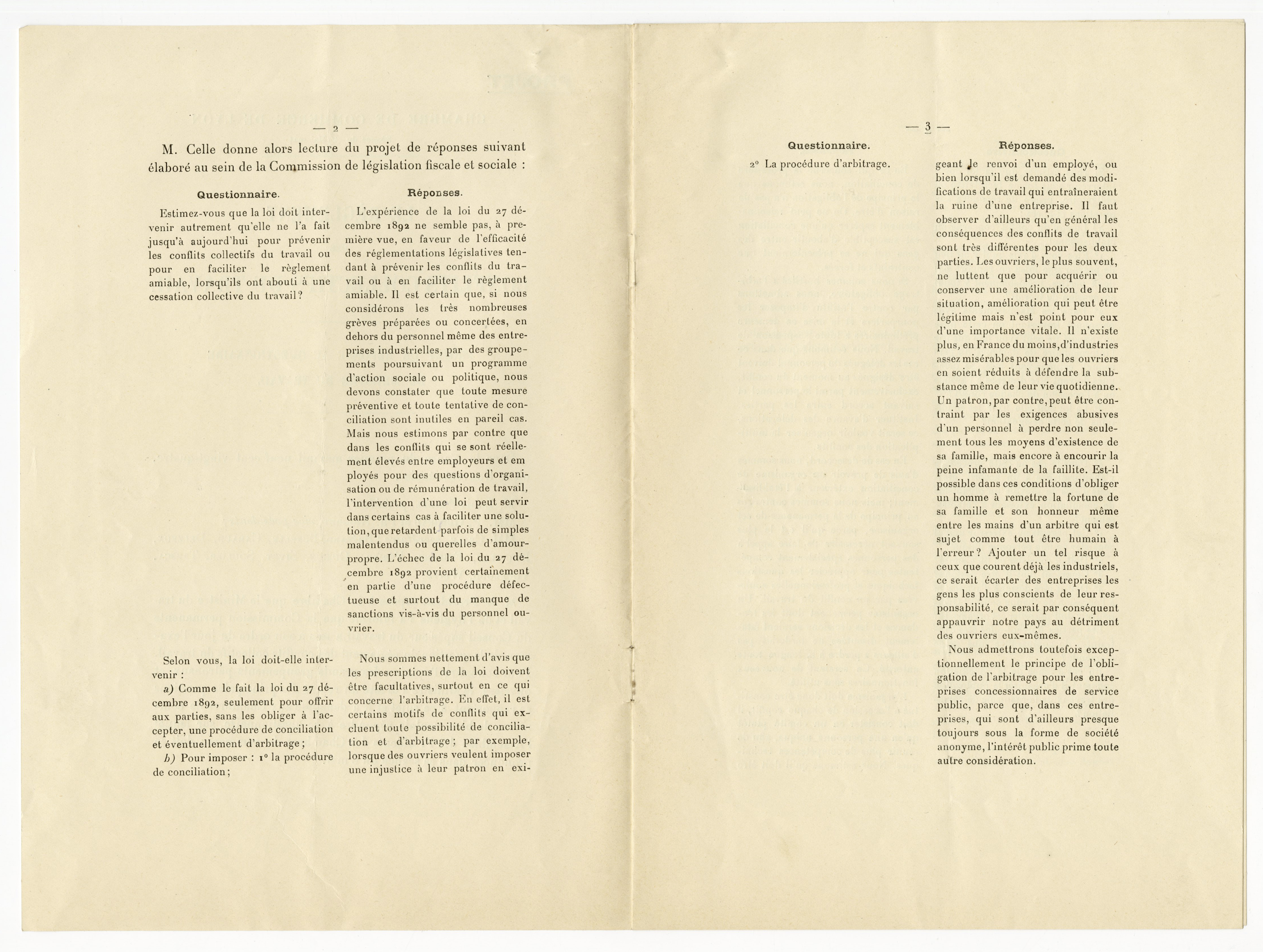L’État intervient plusieurs fois pour pousser le patronat et le monde ouvrier à trouver des solutions, notamment depuis la loi du 27 décembre 1892 qui offre aux parties, sans les obliger à l’accepter, une procédure de conciliation et éventuellement d’arbitrage. En 1924, le ministre du travail fait parvenir un questionnaire sur la question du règlement des conflits collectifs du travail afin de connaitre l’opinion des grands groupements patronaux et ouvriers.