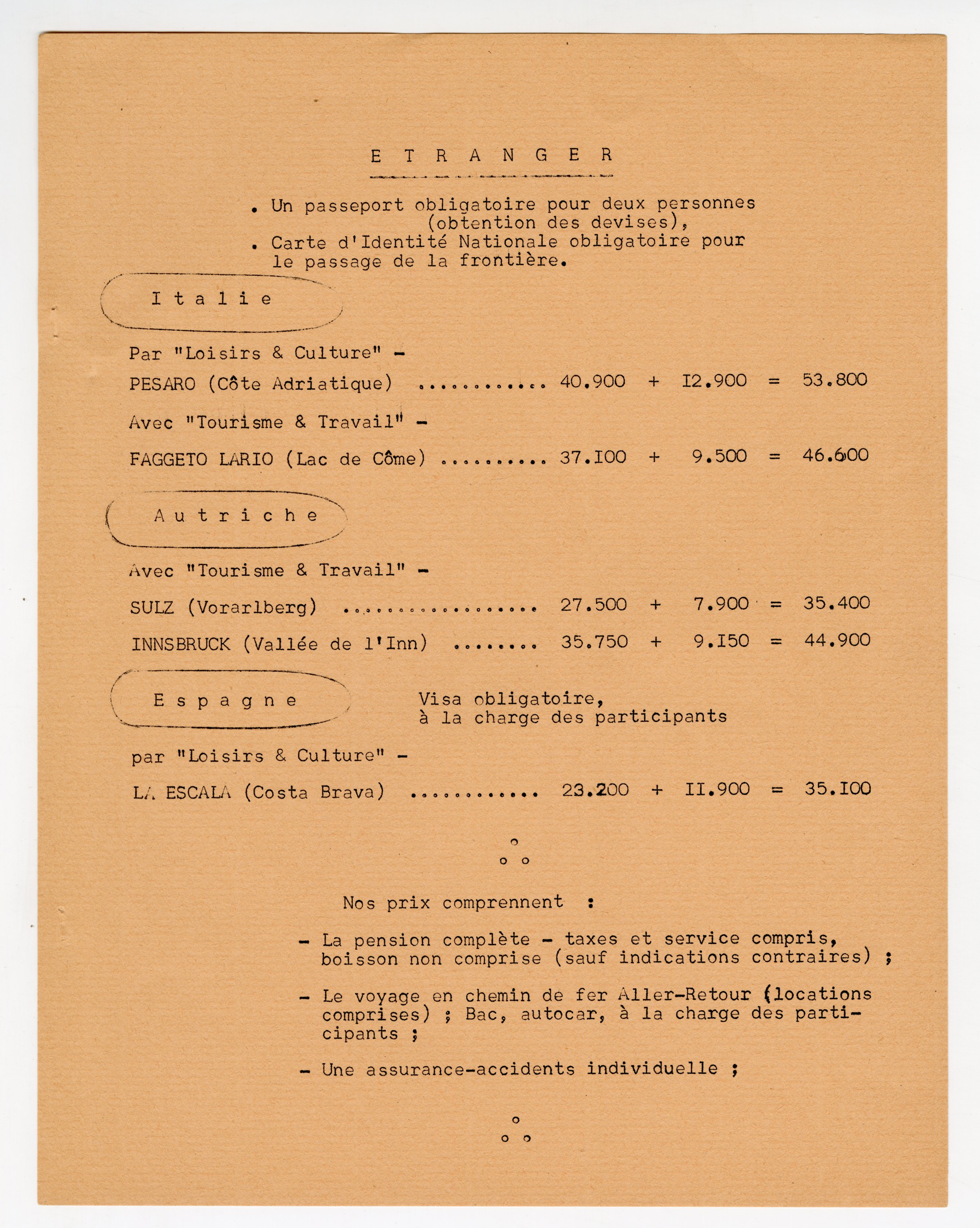 Détail des séjours à l’étranger proposés aux salariés de Renault, 1960.