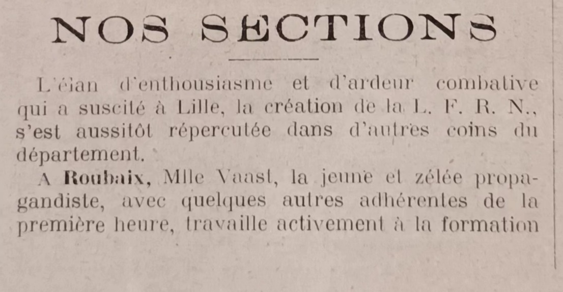 Durant les années trente, Roubaix alors centre de l’industrie textile est fortement impactée par la récession économique. Théâtre d’importants mouvements de grève, cette « ville-usine » marquée par une sensibilité gauchiste devient un terrain privilégié pour les actions de la LFRN qui semble s’y implanter dès sa création fin 1931.