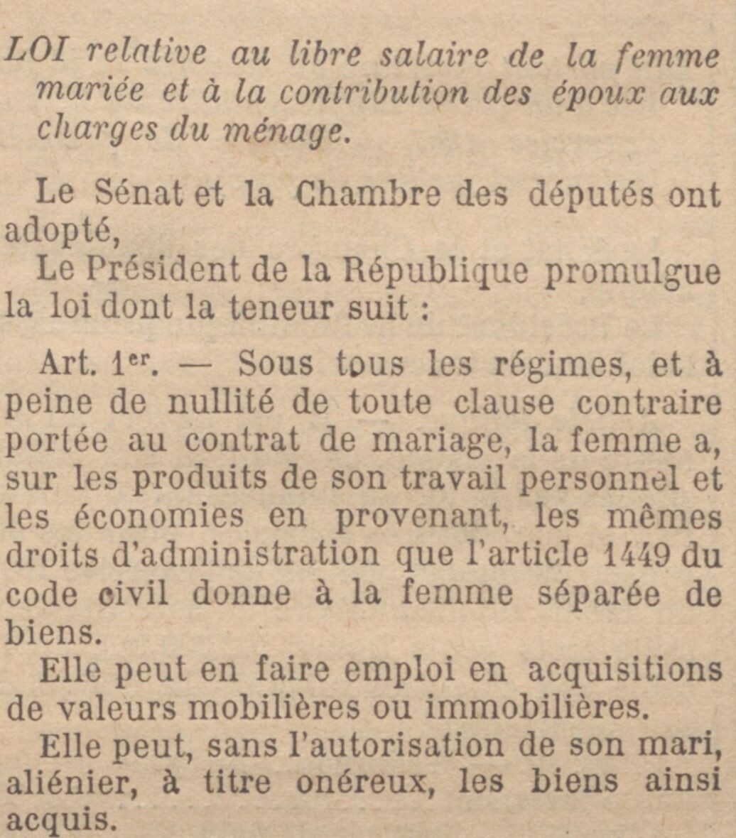 Après plus de treize ans de débats parlementaires, la loi du 13 juillet 1907 reconnaît aux femmes mariées la libre disposition de leur salaire. En reconnaissant l’autonomie individuelle et économique des femmes mariées, cette loi amorce les prémices d’un processus égalitaire au sein des discours législatifs. Toutefois, ce droit demeure partiel, car si la législation admet désormais que la femme dispose librement de son salaire, l’article 2 prévoit « qu’en cas d’abus par la femme des pouvoirs qui lui sont conférés », le mari qui a toujours la jouissance des biens maritaux peut s’opposer à cette liberté. Cette loi est peu appliquée dans la pratique et notamment durant la crise économique.