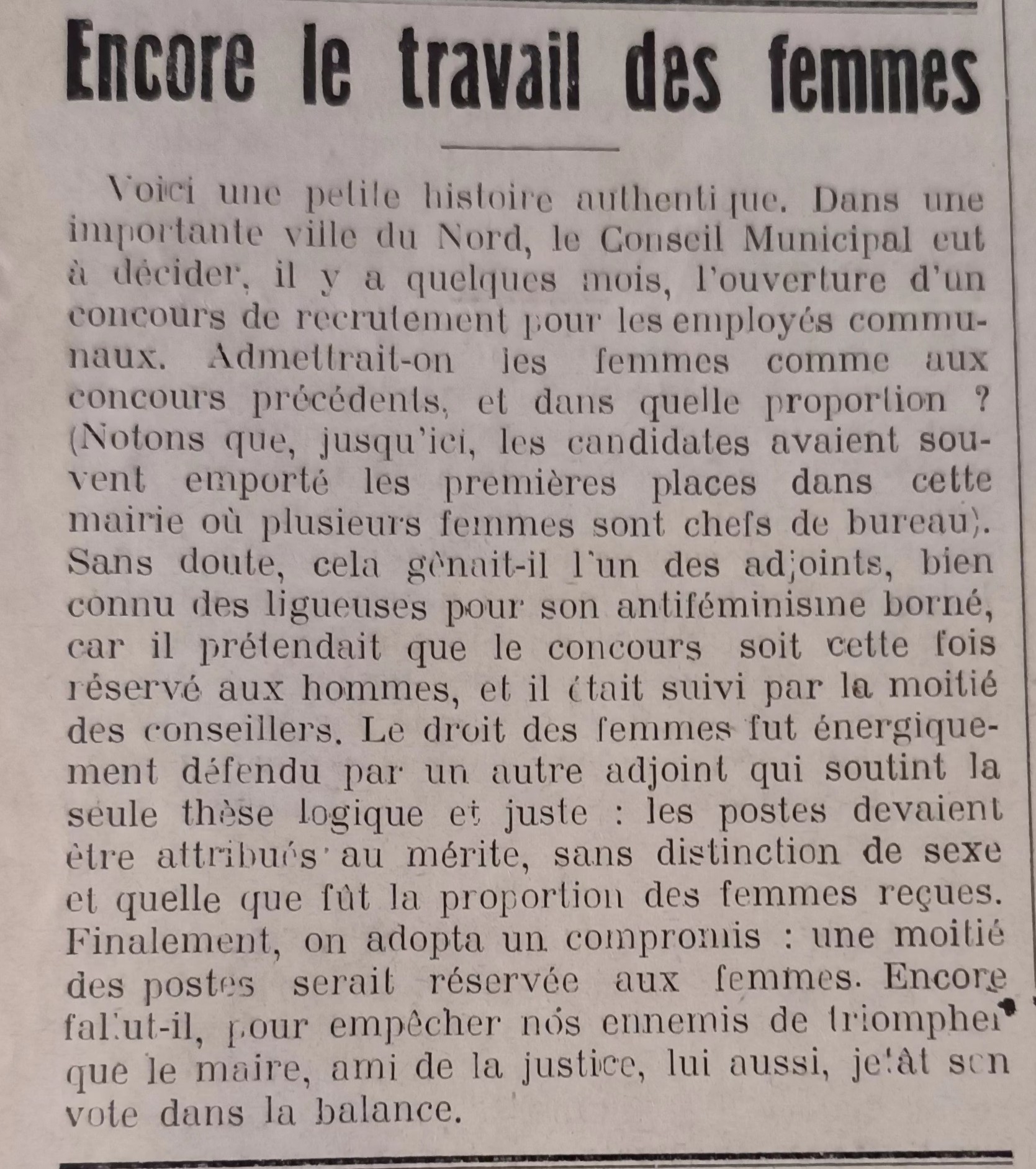 En 1934, alors que le gouvernement Laval adopte des décrets-lois visant à restreindre l’activité professionnelle des femmes, les ligueuses rapportent dans leur organe la tentative de conseillers municipaux « d’une importante ville du nord » d’interdire aux femmes les concours de recrutement d’employés de mairie.