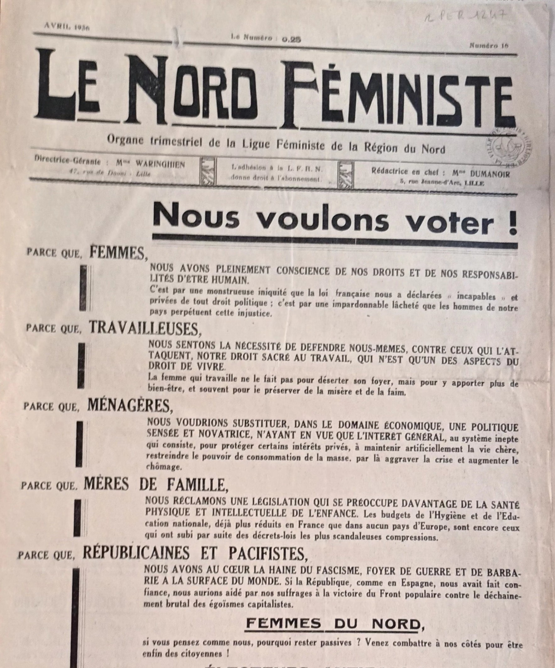 Cette défense du travail féminin est également perceptible à l’échelle régionale, comme l’atteste la Ligue Féministe de la Région du Nord. Créée en 1931, cette association laïque, pacifiste et féministe se mobilise pour l’obtention de droits politiques par les femmes par l’intermédiaire notamment de son journal Le Nord féministe.