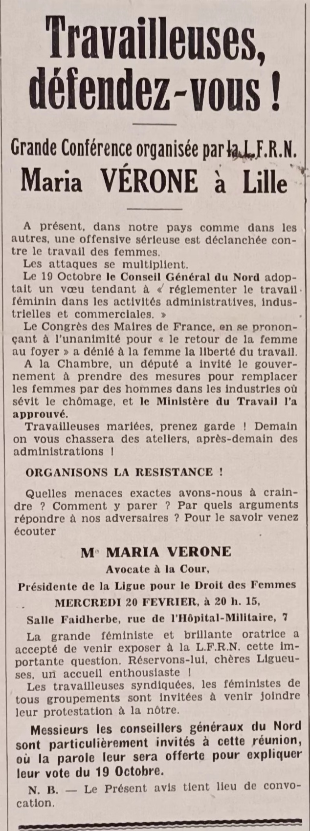 En réaction notamment au vœu du Conseil général du Nord visant à réglementer le travail féminin dans les activités administratives, industrielles et commerciales, la ligue invite l’avocate et socialiste Maria Vérone, présidente de la Ligue française pour le droit des femmes, l’une des plus anciennes associations féministes de France, pour s’exprimer à propos des droits économiques des femmes.