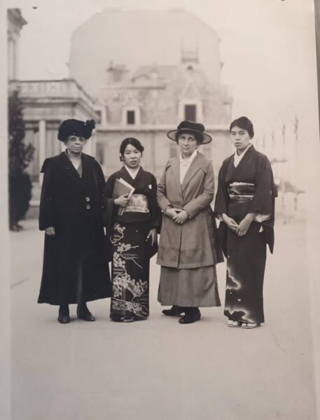 Jeanne Bouvier, à gauche, en compagnie de la délégation japonaise, lors du Congrès international des travailleuses en 1919.